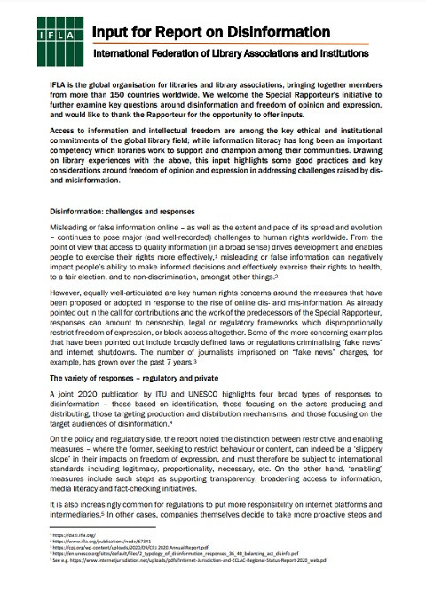 Input for Report on Disinformation Year of publication: 2021 Corporate author: International Federation of Library Associations and Institutions (IFLA) International Federation of Library Associations and Institutions (IFLA) has responded to a call for inputs, issued by the United Nations Special Rapporteur on the promotion and protection of the right to freedom of opinion and expression, about the human rights impacts of measures against disinformation.Access to information and intellectual freedom are among the key ethical and institutional commitments of the global library field; while information literacy has long been an important competency which libraries work to support and champion among their communities. Drawing on library experiences with the above, this input highlights some good practices and key considerations around freedom of opinion and expression in addressing challenges raised by dis and misinformation.