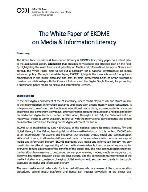 The White Paper of EKOME on Media & Information Literacy Year of publication: 2019 Corporate author: EKOME S.A. The White Paper on Media & Information Literacy is EKOME’s first policy paper on its third pillar in the audiovisual sector, Education that presents its viewpoint and strategic plan on the field. By highlighting the main trends and priorities on Media and Information Literacy in Greece and abroad, the White Paper aims to set out a paradigm for a national infrastructure on media education policy. Through the White Paper, EKOME highlights the main schools of thought and problematics in the public discourse and sets its main intervention fields of action towards a constructive relationship with the Creative Industry and the Digital Single Market, for promoting a sustainable policy model on Media and Information Literacy.