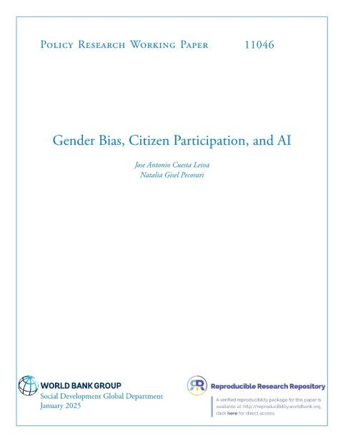 Gender Bias, Citizen Participation, and AI (Policy Research Working Papers; Planet; RRR; 11046) Year of publication: 2025 Author: Jose Antonio Cuesta Leiva | Natalia Gisel Pecorari Corporate author: World Bank This paper investigates the role of gender bias in artificial intelligence–driven analyses of citizen participation, using data from the 2023 Latinobarómetro Survey. The paper proposes that gender bias—whether societal, data driven, or algorithmic—significantly affects civic engagement. Using machine learning, particularly decision trees, the analysis explores how self-reported societal bias (machismo norms) interacts with personal characteristics and circumstances to shape civic participation. The findings show that individuals with reportedly low levels of gender bias, who express political interest, have high levels of education, and align with left-wing views, are more likely to participate. The paper also explores different strategies to mitigate gender bias in both the data and the algorithms, demonstrating that gender bias remains a persistent factor even after applying corrective measures. Notably, lower machismo thresholds are required for participation in more egalitarian societies, with men needing to exhibit especially low machismo levels. Ultimately, the findings emphasize the importance of integrated strategies to tackle gender bias and increase participation, offering a framework for future studies to expand on nonlinear and complex social dynamics.