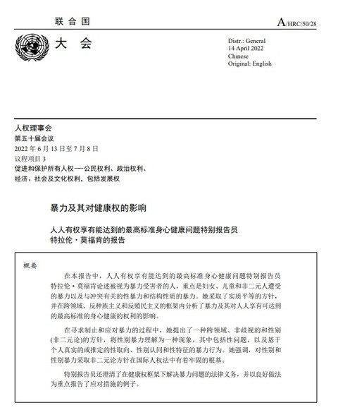 Violence and its Impact on the Right to Health - Report of the Special Rapporteur on the Right of Everyone to the Enjoyment of the Highest Attainable Standard of Physical and Mental Health Year of publication: 2022 Corporate author: UN Human Rights This document is a special report of the UN Special Rapporteur on Human Rights on violence and its impact on the right to health, including the legal framework, an inclusive approach, the identification of multiple forms of violence, and reasonable responses.