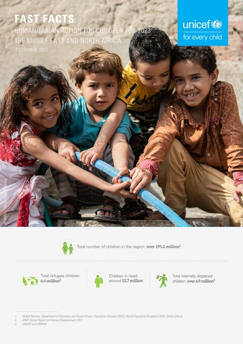 Humanitarian Action for Children in the Middle East and North Africa for 2023: Fast Facts Year of publication: 2022 Corporate author: UNICEF Middle East and North Africa Total number of children in the region: over 191.2 million Total refugee children: 6.4 million Children in need: around 52.7 million Total internally displaced children: over 6.9 million UNICEF MENA is appealing for US$ 2.6 billion to respond to the ongoing humanitarian crises and children’s humanitarian needs around the region.