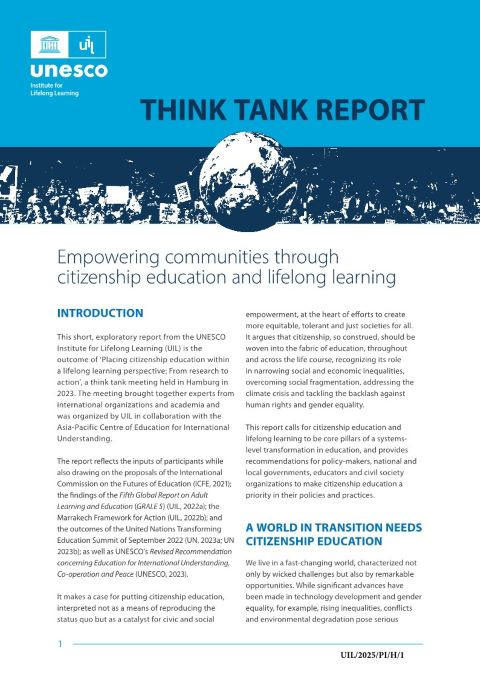 Think Tank Report: Empowering Communities through Citizenship Education and Lifelong Learning Year of publication: 2025 Corporate author: UNESCO Institute for Lifelong Learning (UIL) This short, explorator y repor t from the UNESCO Institute for Lifelong Learning (UIL) is the outcome of ‘Placing citizenship education within a lifelong learning perspective: From research to action’, a think tank meeting held in Hamburg in 2023. The meeting brought together experts from international organizations and academia and was organized by UIL in collaboration with the Asia-Pacific Centre of Education for International Understanding. The report reflects the inputs of participants while also drawing on the proposals of the International Commission on the Futures of Education (ICFE, 2021); the findings of the Fifth Global Report on Adult Learning and Education (GRALE 5) (UIL, 2022a); the Marrakech Framework for Action (UIL, 2022b); and the outcomes of the United Nations Transforming Education Summit of September 2022 (UN, 2023a; UN 2023b); as well as UNESCO’s Revised Recommendation concerning Education for International Understanding, Co-operation and Peace (UNESCO, 2023). It makes a case for putting citizenship education, interpreted not as a means of reproducing the status quo but as a catalyst for civic and social empowerment, at the heart of efforts to create more equitable, tolerant and just societies for all. It argues that citizenship, so construed, should be woven into the fabric of education, throughout and across the life course, recognizing its role in narrowing social and economic inequalities, overcoming social fragmentation, addressing the climate crisis and tackling the backlash against human rights and gender equality. This report calls for citizenship education and lifelong learning to be core pillars of a systems-level transformation in education, and provides recommendations for policy-makers, national and local governments, educators and civil society organizations to make citizenship education a priority in their policies and practices.