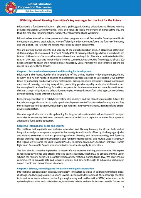 SDG4 High-Level Steering Committee’s Key Messages for the Pact for the Future Year of publication: 2024 Corporate author: SDG4 High-Level Steering Committee Education is a fundamental human right and a public good. Quality education and lifelong learning provides individuals with knowledge, skills, and values to lead a meaningful and productive life, and thus it is essential for personal development, empowerment and wellbeing. Education has a transformative power and drives progress across all Sustainable Development Goals. Investing more, more equitably and more efficiently in education transforms the future of humanity and the planet. The Pact for the Future must put education at its center.