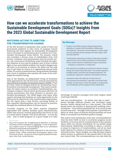 How Can We Accelerate Transformations to Achieve the Sustainable Development Goals (SDGs)? Insights from the 2023 Global Sustainable Development Report (Policy Brief, No. 158) Year of publication: 2024 Author: Stephanie Rambler | Shivani Nayyar | Astra Bonini Corporate author: UN. Department of Economic and Social Affairs (UN. DESA) Key Messages » Progress on the SDGs requires integrated approaches operating at a systemic level that address multiple goals simultaneously. Interventions toward progress on a given target must also generate positive synergies with other targets, while resolving tradeoffs. » Transformative change does not follow a linear path, and policy needs will vary across contexts and phases of transformation. Policies should respond to impediments unique to each phase– emergence, acceleration, or stabilization. » New capacities are needed in all countries for cohesive, forwardlooking, and science-based SDG action. This includes capacity in foresight analysis, innovation and strategy development, risk management, negotiation, mediation, and building resilience. » Investments need to be scaled up in science that can drive necessary transformations, especially in the Global South, including “socially robust” science that speaks to contemporary social challenges and that engages diverse stakeholders.