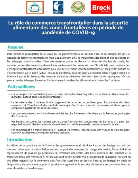 Advocacy Note: The Role of Cross-Border Trade in Security Food in Border Areas During Periods of COVID-19 Pandemic Year of publication: 2022 Corporate author: Centre for International Cooperation and Study (CECI) The Role of Cross-Border Trade in Security food in border areas during periods of COVID-19 pandemic To limit the spread of Covid-19, the governments of Burkina Faso and Senegal have decided to close the borders in March 2020, thus limiting the movement of goods and people and cross-border exchanges. Faced with the measures taken and faced with the absolute necessity of survival, the Traders in cross-border areas bypass official checkpoints to continue trade. cross-border exchanges, necessary for their survival and food security, despite the risks of gender-based violence (GBV). In the event of a pandemic, for countries with still fragile economies such as Burkina Faso and Senegal, selective sanitary measures should rather be applied to enable formal trade and the movement of food across borders.