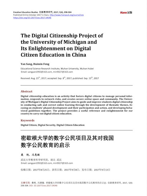 The Digital Citizenship Project of the University of Michigan and Its Enlightenment on Digital Citizen Education in China (Creative Education Studies; vol. 5, no. 4) Year of publication: 2017 Author: Yan Sang | Huimin Feng Digital citizenship education is an activity that fosters digital citizens to manage personal infor- mation, responds to network risks, and creates secure online space and community. The Univer- sity of Michigan’s Digital Citizenship Project aims to guide and improve students digital citizenship in conducting safe and correct online learning through the development of thematic themes, fo- cusing on students’ phased development and their participation and action, and developing beha- vioral guidelines together. The project provides a useful reference and enlightenment for our country to carry out digital citizen education.