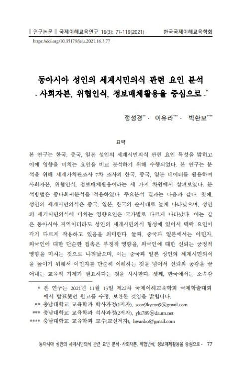 An Analysis of the Factors Affecting East-Asian Adults’ Global Citizenship: Social capital, Threat Recognition, Information Media Utilization (Journal of Education for International Understanding; vol.16, no.3) Year of publication: 2021 Author: Seongkyeong Jeong | Yura Lee | Hwanbo Park Corporate author: Korean Society of Education for International Understanding (KOSEIU) This paper puts an in-depth study on identifying the characteristics of factors related to global citizenship in adults from South Korea, China, and Japan and analyzing the elements affecting them. For this purpose, data from the 7th World Value Survey which was undertaken in South Korea, China, and Japan were used, and they were examined with three different perspectives of social capital, threat recognition, and information media utilization to get to know the influence of variables from various aspects. Multiple regression was applied for this and the results are as follows. Firstly, the global citizenship of adults was high in the order of China, Japan, and South Korea, and the factors influencing global citizenship depend on the country. This implies that contextual factors are acting differently in the formation of the global citizenship of adults even they are from the same East Asian region. Secondly, simple contact with immigrants and foreigners in China and Japan has negative effects while having a positive effect on trust in foreigners. This suggests that an educational mechanism is required to raise trust and empathy beyond understanding immigrants simply to foster global citizenship among Chinese and Japanese adults. Thirdly, depending on the hierarchy of the sense of belonging, the impact on global citizenship was different in South Korea. Educational activities and programs should be implemented to establish the sense of global citizenship of adults in South Korea. Fourthly, the treat perception of social safety and employment insecurity in South Korea and China did not have statistical significance to global citizenship. While the higher the social safety perception the heavier the employment insecurity, adults in Japan had higher global citizenship awareness. This implies that Japanese adults perceive the problems of immigration as a matter of national or social situation and structure. Finally, the utilization of information media in all countries revealed statistical significance, which means that attitude for immigrants would vary depending on which information medica is used from those three countries.