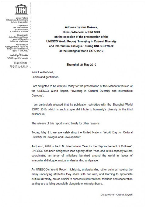 Address by Irina Bokova, Director-General of UNESCO on the occasion of the Plenary Session: Education for Intercultural Citizenship, AoC Third Global Forum; Brazil, 29 May 2010 Year of publication: 2010 Corporate author: UNESCO Director-General, 2009- (Bokova. I.G.) This is an address by Irina Bokova, Director-General of UNESCO on the occasion of the plenary session for Education for Intercultural Citizenship in Brazil, on 29 May 2010. She insisted the importance of education for 'Learning to Live together'. She also highlited education for inter-cultural understanding as an important theme for the 21st centry.