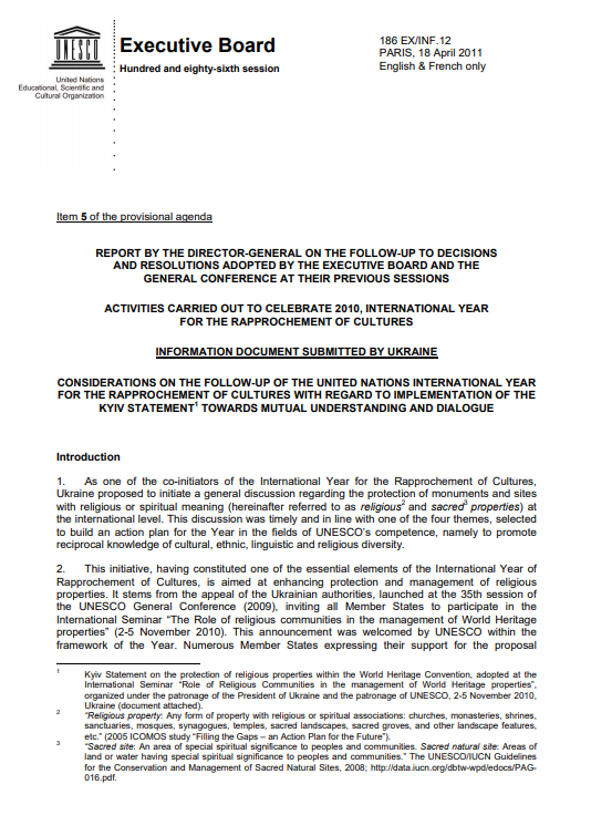 Considerations on the follow-up of the United Nations International Year for the Rapprochement of Cultures with regard to implementation of the Kyiv Statement towards Mutual Understanding and Dialogue Year of publication: 2011 Corporate author: UNESCO As one of the co-initiators of the International Year for the Rapprochement of Cultures, Ukraine proposed to initiate a general discussion regarding the protection of monuments and sites with religious or spiritual meaning (hereinafter referred to as religious2 and sacred3 properties) at the international level. This discussion was timely and in line with one of the four themes, selected to build an action plan for the Year in the fields of UNESCO’s competence, namely to promote reciprocal knowledge of cultural, ethnic, linguistic and religious diversity. 2. This initiative, having constituted one of the essential elements of the International Year of Rapprochement of Cultures, is aimed at enhancing protection and management of religious properties. It stems from the appeal of the Ukrainian authorities, launched at the 35th session of the UNESCO General Conference (2009), inviting all Member States to participate in the International Seminar “The Role of religious communities in the management of World Heritage properties” (2-5 November 2010). This announcement was welcomed by UNESCO within the framework of the Year. Numerous Member States expressing their support for the proposal designated representatives to participate in this Seminar. The elaboration of the Kyiv Statement (as one of the main outcomes of the Seminar) and its adoption in close cooperation with representatives of religious communities contributes to the creation of a culture of dialogue.