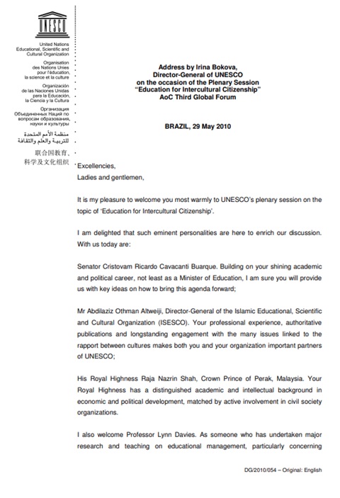 Address by Irina Bokova, Director-General of UNESCO on the occasion of the Plenary Session: Education for Intercultural Citizenship, AoC Third Global Forum; Brazil, 29 May 2010 Year of publication: 2010 Corporate author: UNESCO. Director-General, 2009-2017 (Bokova, I.G.) This is an address by Irina Bokova, Director-General of UNESCO on the occasion of the plenary session for Education for Intercultural Citizenship in Brazil, on 29 May 2010. She insisted the importance of education for 'Learning to Live together'. She also highlited education for inter-cultural understanding as an important theme for the 21st centry.