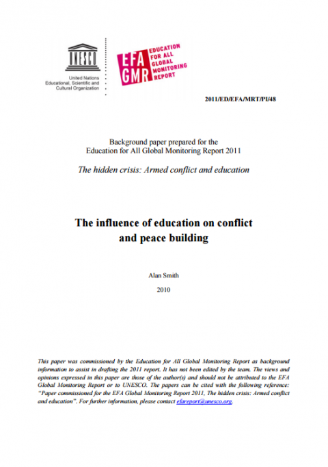 The Influence of education on conflict and peace building Year of publication: 2010 Author: Alan Smith Corporate author: UNESCO The purpose of this paper is to identify aspects of education that may have a positive influence on the dynamics of conflict or make a contribution to peacebuilding. The UN Secretary-General’s (2009) report on peacebuilding identifies a number of recurring priorities in conflict-affected situations, ‘establishing security, building confidence in a political process, delivering initial peace dividends and expanding core national capacity’. These priorities include ‘the provision of basic services, such as water and sanitation, health and primary education’. However, in conflict-affected situations education is also about more than service delivery because it is a means of socialization and identity development through the transmission of knowledge, skills, values and attitudes across generations. Education may therefore be a driver of conflict (fuelling grievances, stereotypes, xenophobia and other antagonisms), but can also be a way of contributing to ‘conflict transformation’ and ‘peacebuilding’.