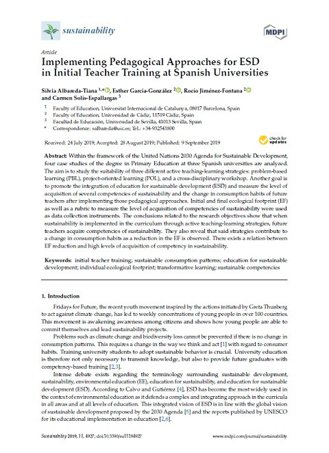 Implementing Pedagogical Approaches for ESD in Initial Teacher Training at Spanish Universities (Sustainability 2019; Vol. 11, No. 18) Year of publication: 2019 Author: Sílvia Albareda-Tiana | Esther García-González | Rocío Jiménez-Fontana | Carmen Solís-Espallargas Corporate author: Multidisciplinary Digital Publishing Institute (MDPI) Within the framework of the United Nations 2030 Agenda for Sustainable Development, four case studies of the degree in Primary Education at three Spanish universities are analyzed. The aim is to study the suitability of three different active teaching-learning strategies: problem-based learning (PBL), project-oriented learning (POL), and a cross-disciplinary workshop. Another goal is to promote the integration of education for sustainable development (ESD) and measure the level of acquisition of several competencies of sustainability and the change in consumption habits of future teachers after implementing those pedagogical approaches. Initial and final ecological footprint (EF) as well as a rubric to measure the level of acquisition of competencies of sustainability were used as data collection instruments. The conclusions related to the research objectives show that when sustainability is implemented in the curriculum through active teaching-learning strategies, future teachers acquire competencies of sustainability. They also reveal that said strategies contribute to a change in consumption habits as a reduction in the EF is observed. There exists a relation between EF reduction and high levels of acquisition of competency in sustainability.