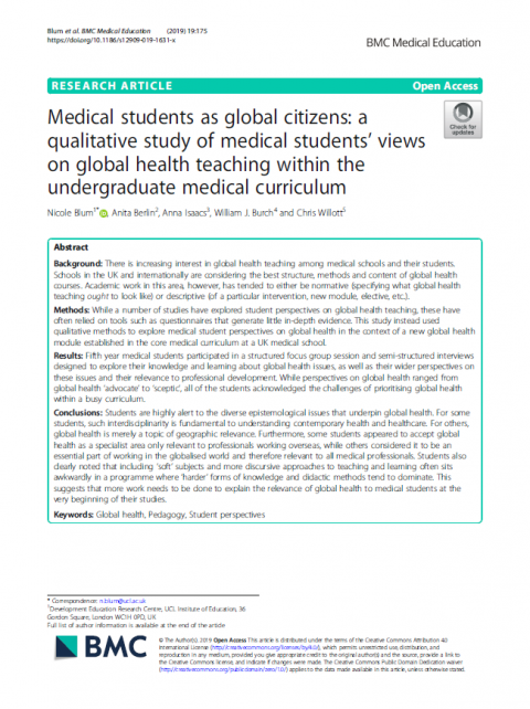 Medical students as global citizens: a qualitative study of medical students’ views on global health teaching within the undergraduate medical curriculum Year of publication: 2019 Author: Nicole Blum | Anita Berlin | Anna Isaacs | William J. Burch | Chris Willott The paper, entitled "Medical students as global citizens: a qualitative study of medical students’ views on global health teaching within the undergraduate medical curriculum", is based on a small-scale qualitative study with UCL(University College London) medical students. It aimed to explore Year 5 medical students’ knowledge and learning about global health issues, as well as their wider perspectives on its relevance to their professional development. The work builds on DERC(Development Education Research Centre)’s long-term interest in global issues within the initial training and professional development of a number of key global professions, such as teaching, medicine and engineering.