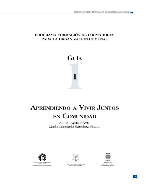 Learning to Live Together in Community: Training of Trainers Program for Community Organization; Guide 1 Year of publication: 2007 Author: Adolfo Aguilar Ávuila | María Consulo Sánches Plazas Corporate author: Columbia. Ministry of the Interior and Justice | National Pedagogical University The purpose of this guide is to generate conditions that contribute to identifying conceptual and methodological elements that contribute to the strengthening, integration and creation of an environment of coexistence in the community organization, so that it can be projected with greater probability of success.