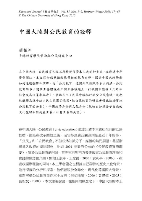 Conceptualization of Citizenship Education in the Chinese Mainland (Education Journal 《教育學報》; Vol. 37) Year of publication: 2010 Author: Zhao Zhengzhou Corporate author: Chinese University of Hong Kong This paper discusses how Chinese academics conceptualised Citizenship Education. It provides a local perspective on this issue, including breaking state hegemony, struggling for democracy and balancing political identity and cultural identity.