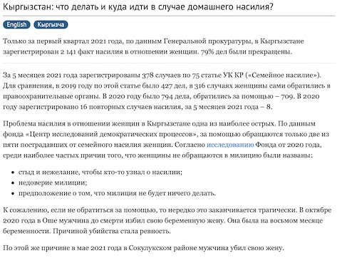 Kyrgyzstan: What to Do and Where to Go in Case of Domestic Violence? Year of publication: 2021 Author: Mehrinisa Sulaimanovna Corporate author: Central Asian Bureau for Analytical Reporting (CABAR) The problem of violence against women in Kyrgyzstan is one of the most relevant. According to the Centre for Democratic Processes Studies Fund, only two of five female victims of domestic violence call for help.