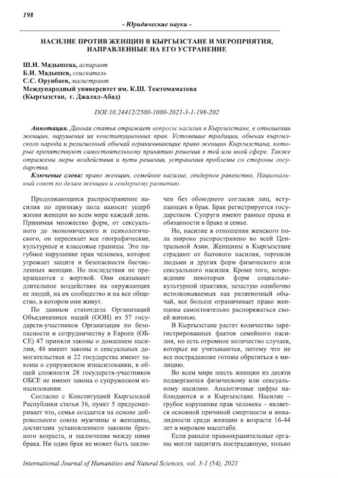 Violence Against Women in Kyrgyzstan and Activities Aimed at Its Elimination (International Journal of Humanities and Natural Sciences; vol. 3-1, no. 54) Year of publication: 2021 Author: Sh.I. Madisheva | B.I. Madyshev | S.S. Orunbaev This article reflects the issues of violence in Kyrgyzstan against women, violation of their constitutional rights. Persistent traditions, customs of the Kyrgyz people and religious custom that restrict the rights of women in Kyrgyzstan, which hinder independent decision-making in a particular area. Also reflects the measures of influence and ways of solving, eliminating the problem from the state.