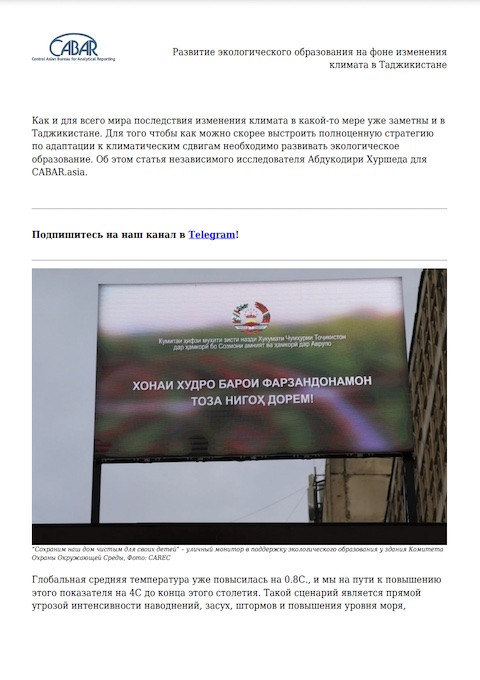 Development of Environmental Education Against the Background of Climate Change in Tajikistan Year of publication: 2021 Author: Khurshed Abdukodiri Corporate author: Central Asian Bureau for Analytical Reporting (CABAR) As well as for the whole world, the consequences of climate change are to some extent already noticeable in Tajikistan. In order to build a full-fledged strategy for adaptation to climate change as soon as possible, it is necessary to develop environmental education.