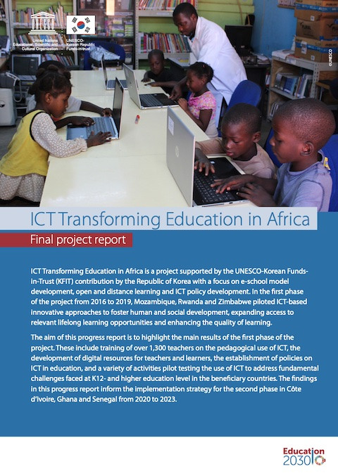 ICT Transforming Education in Africa: Final Project Report Year of publication: 2020 Corporate author: UNESCO ICT Transforming Education in Africa is a project supported by the UNESCO-Korean Funds- in-Trust (KFIT) contribution by the Republic of Korea with a focus on e-school model development, open and distance learning and ICT policy development. In the first phase of the project from 2016 to 2019, Mozambique, Rwanda and Zimbabwe piloted ICT-based innovative approaches to foster human and social development, expanding access to relevant lifelong learning opportunities and enhancing the quality of learning.The aim of this progress report is to highlight the main results of the first phase of the project. These include training of over 1,300 teachers on the pedagogical use of ICT, the development of digital resources for teachers and learners, the establishment of policies on ICT in education, and a variety of activities pilot testing the use of ICT to address fundamental challenges faced at K12- and higher education level in the beneficiary countries. The findings in this progress report inform the implementation strategy for the second phase in Côte d’Ivoire, Ghana and Senegal from 2020 to 2023.