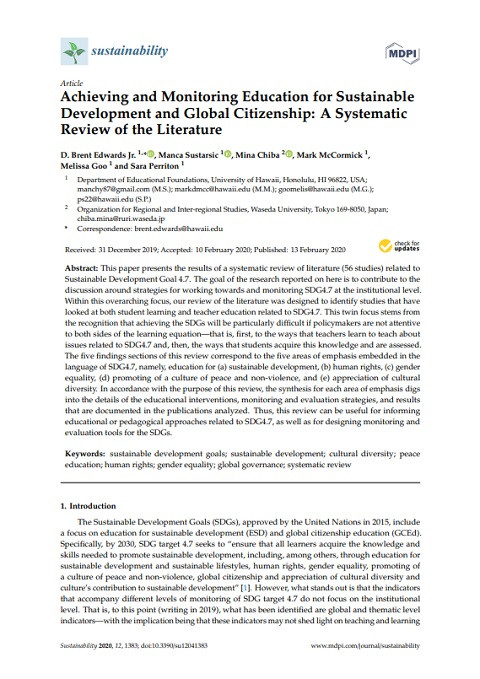 Achieving and Monitoring Education for Sustainable Development and Global Citizenship: A Systematic Review of the Literature (Sustainability 2020; Vol. 12, No. 4) Year of publication: 2020 Author: Brent Edwards | Manca Sustarsic | Mina Chiba | Mark McCormick | Melissa Goo | Sara Perriton Corporate author: Multidisciplinary Digital Publishing Institute (MDPI) This paper presents the results of a systematic review of literature (56 studies) related to Sustainable Development Goal 4.7. The goal of the research reported on here is to contribute to the discussion around strategies for working towards and monitoring SDG4.7 at the institutional level. Within this overarching focus, our review of the literature was designed to identify studies that have looked at both student learning and teacher education related to SDG4.7. This twin focus stems from the recognition that achieving the SDGs will be particularly difficult if policymakers are not attentive to both sides of the learning equation—that is, first, to the ways that teachers learn to teach about issues related to SDG4.7 and, then, the ways that students acquire this knowledge and are assessed. The five findings sections of this review correspond to the five areas of emphasis embedded in the language of SDG4.7, namely, education for (a) sustainable development, (b) human rights, (c) gender equality, (d) promoting of a culture of peace and non-violence, and (e) appreciation of cultural diversity. In accordance with the purpose of this review, the synthesis for each area of emphasis digs into the details of the educational interventions, monitoring and evaluation strategies, and results that are documented in the publications analyzed. Thus, this review can be useful for informing educational or pedagogical approaches related to SDG4.7, as well as for designing monitoring and evaluation tools for the SDGs.