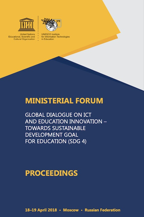 Ministerial Forum: Global Dialogue on ICT and Education Innovation – Towards Sustainable Development Goal for Education (SDG 4); Proceedings Year of publication: 2019 Corporate author: UNESCO Institute for Information Technologies in Education (IITE) The present publication contains articles based on the outcomes of the Ministerial Forum “Global Dialogue on ICT and Education Innovation – Towards Sustainable Development Goal for Education (SDG 4)”, organized by UNESCO IITE in cooperation with the Ministry of Education and Science of the Russian Federation in Moscow (Russia) on 18-19 March, within the Moscow International Education Fair 2018 (MIEF 2018).The publication covers the flagship topics such as ICT potential for future teachers and future schools, digital pedagogy and OER, collaboration between public and private sectors in the use of ICT in education, digital technologies for quality and equity in education.