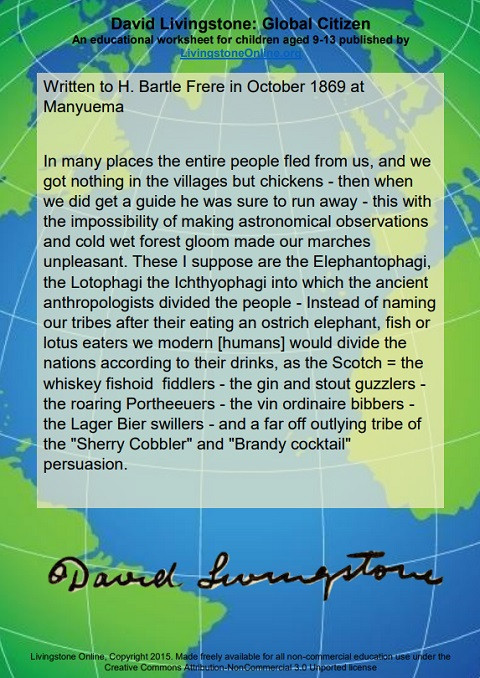 David Livingstone: Global Citizen Year of publication: 2015 Author: Kate Simpson | Megan Ward Corporate author: Livingstone Online This material urges students to explore the term global citizenship and what it means to them. Students can use Livingstone’s letter to practice their deep reading skills, finding out what the letter reveals about nineteenth-century perspectives on global life.