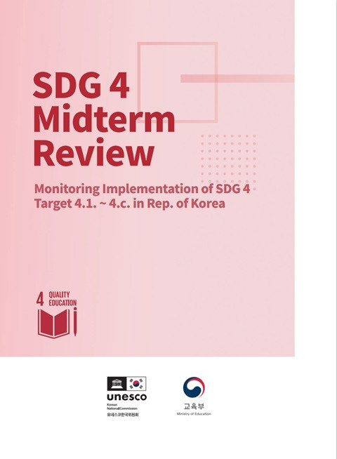 SDG 4 Midterm Review: Monitoring Implementation of SDG 4 Target 4.1. ~ 4.c. in Rep. of Korea Year of publication: 2023 Author: Hunwoo Joo | Mikyung Kim | Mugyeong Moon | Jeongwon Hwang | Kirak Ryu | Hyeseung Cho | Yunjeong Choi | Hyosook Shin | Kyungsook Kang | Minseon Park | Eunju Lee | Jonghun Kim | Nayoung Kim | Hwanbo Park | Hannah Kim Corporate author: National Consultative Group on Education 2030 | Korean National Commission for UNESCO This report presents the compiled work from the National Consultative Group and Working Groups on Education 2030 of the Republic of Korea regarding the midterm review on the implementation of SDG 4.