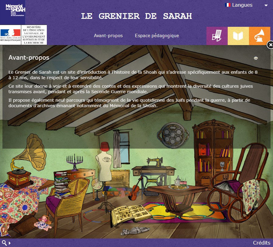 Le grenier de Sarah Author: Jacques Fredj | Barbara Mellul | Adeline Salmon | Barbara Mellul | Adeline Salmon | Tralalère | Alliance concept | Judith Panijel | Alban Perrin | Iannis Roder Lior Lalieu-Smadja | Karen Taieb | Ariel Sion Corporate author: Memorial de la Shoah Le Grenier de Sarah est un site d’introduction à l’histoire de la Shoah, créé spécifiquement pour les enfants de 8 à 12 ans, dans le respect de la sensibilité des jeunes visiteurs. Les choix éditoriaux et iconographiques du site traduisent scrupuleusement cette volonté de ne pas les choquer. Le site a été conçu à partir du questionnement des enfants sur cette période.- Qui étaient ces personnes que les nazis ont voulu assassiner ?- Dans quels pays vivaient-elles ? Quelles langues parlaient-elles ?- Quels ont été les parcours propres à chacune d’entre-elles ?Le Grenier de Sarah permet aux enfants de naviguer sur le site de façon autonome. Toutefois, il est conseillé aux adultes de les accompagner lors de leur première visite afin d’instaurer un dialogue et de répondre à d’éventuelles questions.Pour y répondre, trois rubriques, « Il était une fois », « Des mots à l’oreille » et « En noir et blanc », donnent des clefs de compréhension.- Dans « Il était une fois », des contes donnent un aperçu de la diversité des cultures juives. - Dans « Des mots à l’oreille », des expressions en hébreu, yiddish, judéo-espagnol et judéo-arabe ouvrent une fenêtre sur la pluralité du judaïsme. - Dans « En noir en blanc », neuf parcours témoignent de la vie quotidienne des Juifs pendant la guerre. En cliquant sur l’album photo, l’enfant choisit d’entendre un des récits de vie proposés.Tout au long de chaque parcours, des définitions et des documents, sont à la disposition du jeune visiteur. Pour les enseignants, un espace pédagogique spécifique a été créé afin d’y trouver des ressources complémentaires et des pistes de travail. Sarah’s attic is a website introducing to the Shoah History. It was specifically created for children from age 8 to 12 and respects their sensibility as young visitors. The contents and iconography are carefully intended to suit their emotional and cognitive abilities.The website was designed and elaborated from questions asked by children in History classes teaching this time period - Who were these persons the Nazis wanted to murder?- In which countries did they live? Which languages did they speak?- What were their personal experiences? Sarah’s attic enables children to navigate through the website on their own. Nevertheless, we recommend that adults accompany them on their first visit in order to create a dialog and answer possible questions.As part of a school or extra-curricular framework, this program can be used in small groups with the guidance of an adult.In order to answer these questions, three sections “Once upon a time”, “Words to my ear” and “In black and white” give keys to understanding the event.- In “Once upon a time”, tales give a glimpse of the diversity of Jewish cultures. - In “Words to my ear”, expressions in Hebrew, Yiddish, Judeo-Spanish and Judeo-Arabic open a window on the pluralism of Judaism. - In “In Black and white”, nine personal itineraries bear witness of the daily life of Jews during the war. Along each personal story, definitions and documents are available to the young visitor.For teachers and educators, a specific educational section contains additional resources, guidelines and teaching materials.