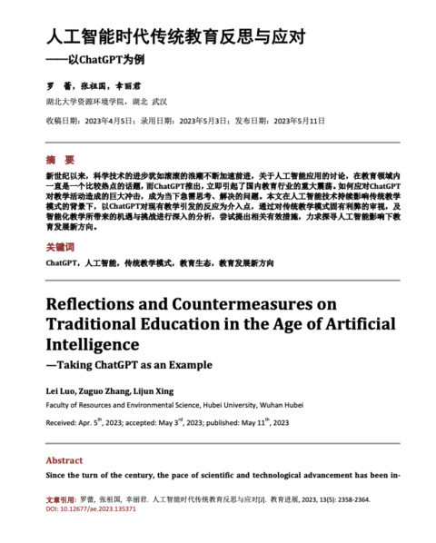 Reflections and Countermeasures on Traditional Education in the Age of Artificial Intelligence: Taking ChatGPT as an Example (Advances in Education; Vol.13, No.5) Year of publication: 2023 Author: 罗蕾 | 张祖国 | 幸丽君 Since the turn of the century, the pace of scientific and technological advancement has been increasing rapidly, like a rolling wave gaining momentum. As a result, the topic of artificial intelli-gence and its potential applications has remained a hot topic in the field of education. The introduction of ChatGPT had an immediate and significant impact on the domestic education industry. Addressing how to manage this impact on teaching activities has become an urgent issue that requires prompt consideration and resolution. In light of the ongoing impact of artificial intelligence technology on traditional teaching methods, this article focuses on ChatGPT’s response as an intervention point, delving into a thorough analysis of the inherent strengths and weaknesses of traditional teaching modes, as well as the opportunities and challenges presented by intelligent teaching. Through our analysis of artificial intelligence, we aim to propose effective measures and explore new directions for the development of education in its influence.