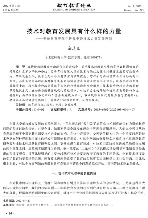 What Kind of Power Does Technology Have on the Development of Education: On the Development Principle of Technical Force in the Process of Educational Modernization (Modern Education Review; No.3, 2022) Year of publication: 2022 Author: 余清臣 In the process of continuously promoting the comprehensive modernization of education, the issue of what influence technology has on the development of education has caused many debates and disputes. Therefore, it is necessary to deeply explore the connotation of technology and the possible influence of technology on the development of education. Up to now, technology has been a concept with multiple connotations, which can be divided into two levels:core essence and peripheral influence. At present, the influence of technology with multiple connotations on educational development is manifested in three aspects:technology enriches and upgrades educational means, promotes and changes the action efficiency and life form of educational subjects, and influences and changes the way the educational world is organized. In the process of comprehensively promoting the modernization of education, the planning and application of technological forces in education should focus on promoting the all-round development of mankind in the world, not on defeating or replacing other forces, and pursue the organic combination with other forces. In addition, continuous introspection, feedback and correction are also very important.