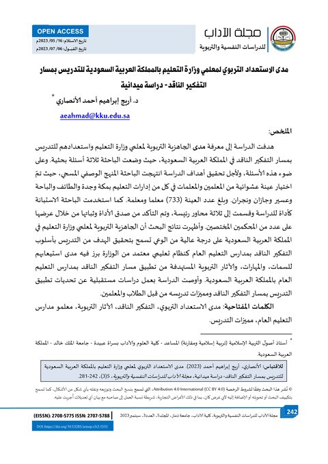 The Extent of Educational Readiness of Using Thinking Skills Strategy among Teachers at the Ministry of Education, Saudi Arabia: A Field Study (Arts for Educational & Psychological Studies; Vol.5, No.3) Year of publication: 2023 Author: Areej Ibrahim Ahmed Al Ansari Corporate author: Dhamar University This study aimed to identify educational readiness and willingness of teachers affiliated to the Ministry of Education to use critical thinking in their teaching, in Saudi Arabia. To achieve the study objectives, the descriptive survey method was adopted, and a questionnaire was used to collect data from the study sample which consisted of (733) male and female teachers, randomly selected from education directorates of Makkah, Jeddah, Taif, Al-Baha, Asir, Jazan, and Najran. The questionnaire included three main dimensions;and after testing its validity, and reliability, it was administered to the sample. The study results showed that teachers’ educational readiness scored a high degree of awareness that would allow achieving the goal of teaching by using critical thinking in schools as a teaching strategy approved by the Ministry of Education. The teachers also showed their understanding of the characteristics, skills and educational effects of the application of the critical thinking strategy in schools. The study recommended conducting future studies on the challenges and advantages of applying the critical thinking strategy from the perspective of students and teachers.Keywords: Extent of educational readiness, Critical thinking, Educational effects, School teachers.