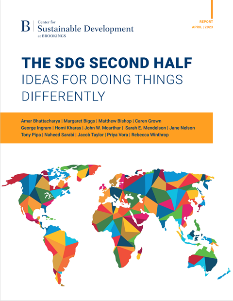 The SDG second half: Ideas for doing things differently Year of publication: 2023 Author: Amar Bhattacharya | Margaret Biggs | Matthew Bishop | Caren Grown | George Ingram | Homi Kharas | John W. Mcarthur | Sarah E. Mendelson | Jane Nelson | Tony Pipa | Naheed Sarabi | Jacob Taylor | Priya Vora | Rebecca Winthrop Corporate author: Center for Sustainable Development at Brookings This short compendium captures a cross section of SDG-focused insights and recommendations from CSD-affiliated scholars. Each brief essay describes something with the potential to be done differently during the second half of the SDG era. Across a dozen contributions, topics range from reframing media coverage of the SDGs to measuring and elevating the role of the private sector; from participatory approaches to transforming education systems to new learning paradigms for human rights; from better risk-taking in fragile countries to improving infrastructure and services for care; from fit-for-purpose multilateral development banks to a purpose-driven fund to end extreme poverty; from turbo-charged Canadian SDG approaches to renewed American SDG leadership; from breakthroughs in digital public infrastructure to innovative frontiers in the digitally empowered methods of collective behavior science.