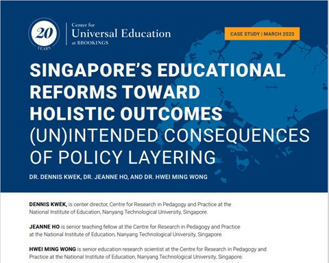 Singapore’s educational reforms toward holistic outcomes: (Un)intended consequences of policy layering Year of publication: 2023 Author: Dennis Kwek | Jeanne Ho | Hwei Ming Wong Corporate author: Center for Universal Education at Brookings In the transition from economic imperatives to holistic drivers, there has been a gradual move over five policy phases (from 1965 to 2022 and beyond) toward curriculum and school diversification to cater to different students, with more autonomy given to schools to innovate their pedagogy and improve instructional quality to meet their students’ unique needs. Importantly, there has been a shift in policy rhetoric from focusing on educational structures to focusing on pedagogy and instructional quality. To shift pedagogy from being mainly didactic in nature—with emphasis on preparing students for national examination—the Singapore government recognized the need to focus on school leaders’ and teachers’ capacity building to enable new curricula and teaching practices. The school cluster structure was initiated in 1997 to enable collaboration and learning among school leaders, key personnel, and teachers. Opportunities for collaborative teacher learning are provided at different ecological levels: professional learning communities (PLCs) within schools and networked learning communities (NLCs) across schools. Beyond the education system, the Singapore government works with other ministries and community organizations, such as ethnic self-help organizations, to tackle educational equity issues. Ultimately, even though the official policy narrative post-1997 has been a de-emphasis on examination results and educational infrastructure to help improve the instructional quality in schools toward holistic outcomes and improved student well-being have been developed, education systems building co-exists with an alternative underlying shadow education system valued by parents who continue to chase narrow academic outcomes. Tuition and enrichment centers in Singapore constitute the shadow education system.