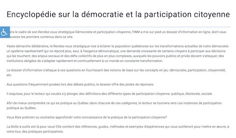 Encyclopedia on Democracy and Citizen Participation Author: Malorie Flon | Émilie Béorofei Corporate author: Institut du Nouveau Monde (INM) As part of its Strategic Meeting on Democracy and Citizen Participation, the INM has set up an online information pack, the first contents of which you will find on this site.A vast deliberative process, the Strategic Rendezvous aims to enlighten the people of Quebec on the current transformations of our democracy: a representative system that no longer responds, on its own, to the democratic requirement; a growing demand from certain citizens to participate in decisions that affect them; increasingly complex social issues and collective challenges, which public and private authorities must tackle; institutions forced to adapt quickly and continuously to a constantly changing world.The Briefing Kit tackles these questions by providing basic notions of the concepts involved: democracy, participation, citizenship, etc. To questions frequently asked during public debates, the dossier offers some possible answers. It outlines, for the reader who wants to dive into it, definitions of the different types of citizen participation: public, electoral, social. In order to better understand what is practiced in Quebec in each of these categories, the reader will turn to The authorities of public participation in Quebec.Are you a practitioner or would you like to deepen your knowledge of the practice of citizen participation? The Toolbox is here for you! It contains references, guides, methods and examples of experiences that will equip you to implement, in turn, participatory practices.