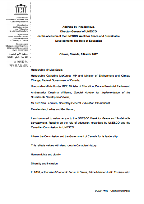 Address by Irina Bokova, Director-General of UNESCO, on the occasion of the UNESCO Week for Peace and Sustainable Development: The Role of Education; Ottawa, Canada, 8 March 2017 Year of publication: 2017 Corporate author: UNESCO. Director-General, 2009-2017 (Bokova, I.G.) This address was presented by Irina Bokova, Director-General of UNESCO on the occasion of the UNESCO Week for Peace and Sustainable Development. She highlights on the role of education.