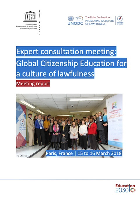 Expert Consultation Meeting: Global Citizenship Education for a Culture of Lawfulness; Meeting Report Year of publication: 2018 Corporate author: UNESCO | UN. Office on Drugs and Crime (UNODC) In the context of a UNESCO/UNODC partnership on “Global Citizenship Education for a Culture of Lawfulness”, an expert consultation meeting was held in Paris on March 15 and 16 of 2018. The purpose of the partnership is to strengthen the capacities of educational systems to promote the rule of law. To this end, the partnership aims to empower and equip learners to act and engage in society as constructive and ethically responsible agents of change, supporting peace, justice, and strong institutions. This notably contributes to the achievement of the 2030 Agenda for Sustainable Development, and in particular Sustainable Development Goals 4 and 16. Additionally, the partnership intends to enable learners to be both motivated and capable to respond resiliently to crime and violence. The meeting had three broad objectives: To help clarify the conceptual foundation of the partnership; to identify the measures that can be taken in the education sector to promote a culture of lawfulness; and to identify effective educational approaches. Thus, the meeting is meant to elucidate core concepts and identify promising educational approaches in the promotion of a culture of lawfulness by asking fundamental questions, including: What constitutes the rule of law and a culture of lawfulness? How do we create demand for the rule of law? How do we ensure learners apply these principles? How do we ensure they survive in a context where there is no rule of law?