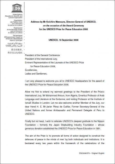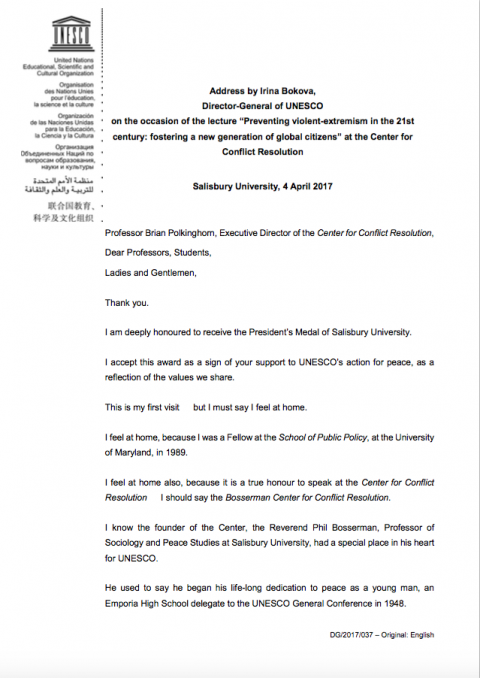 Address by Irina Bokova, Director-General of UNESCO, on the occasion of the lecture: Preventing violent-extremism in the 21st century: fostering a new generation of global citizens at the Center for Conflict Resolution; Salisbury University, 4 April 2017 Year of publication: 2017 Corporate author: UNESCO. Director-General, 2009-2017 (Bokova, I.G.) This address was given by Irina Bokova, Director-General of UNESCO on the occasion of the lecture “Preventing violent-extremism in the 21st century: fostering a new generation of global citizens” at the Center for Conflict Resolution.