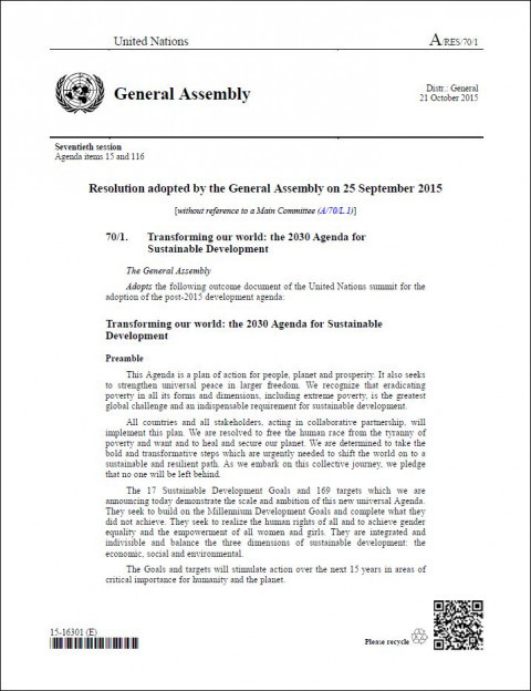 Transforming Our World: The 2030 Agenda for Sustainable Development Year of publication: 2015 Corporate author: United Nations (UN) This Agenda is a plan of action for people, planet and prosperity. It also seeks to strengthen universal peace in larger freedom. We recognize that eradicating poverty in all its forms and dimensions, including extreme poverty, is the greatest global challenge and an indispensable requirement for sustainable development. All countries and all stakeholders, acting in collaborative partnership, will implement this plan. We are resolved to free the human race from the tyranny of poverty and want and to heal and secure our planet. We are determined to take the bold and transformative steps which are urgently needed to shift the world on to a sustainable and resilient path. As we embark on this collective journey, we pledge that no one will be left behind. The 17 Sustainable Development Goals and 169 targets which we are announcing today demonstrate the scale and ambition of this new universal Agenda. They seek to build on the Millennium Development Goals and complete what they did not achieve. They seek to realize the human rights of all and to achieve gender equality and the empowerment of all women and girls. They are integrated and indivisible and balance the three dimensions of sustainable development: the economic, social and environmental. The Goals and targets will stimulate action over the next 15 years in areas of critical importance for humanity and the planet.