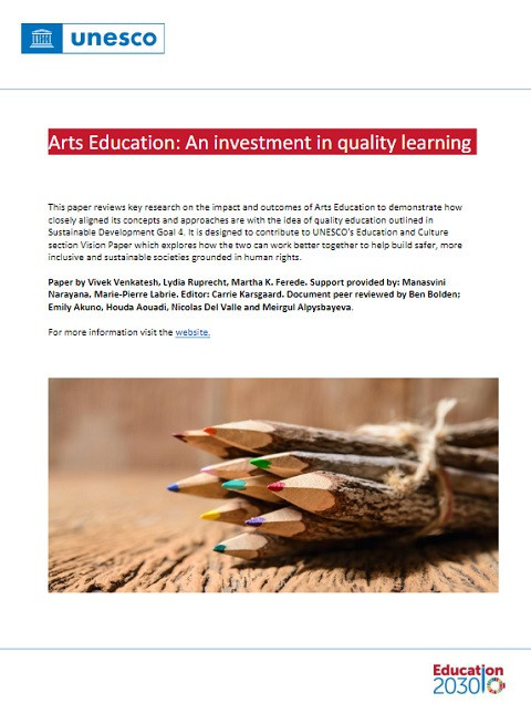 Arts Education: An Investment in Quality Learning Year of publication: 2023 Author: Vivek Venkatesh | Lydia Ruprecht | Martha K. Ferede Corporate author: UNESCO This paper reviews key research on the impact and outcomes of Arts Education (AE), with the objective of demonstrating how AE and its conceptualizations, methodological approaches, theoretical foundations and applications are closely aligned with the objectives and expectations of quality education as notably envisioned by Sustainable Development Goal 4 (SDG 4) on education. For UNESCO (2006), AE is understood to include two different approaches: o the teaching of art as an individual study subject and AE as developing learners’ artistic skills, abilities and sensibilities; o the mobilization of the arts, its tools, methods and stakeholders as a pedagogical approach, also referred to as 'arts in education' or 'learning through the arts.”The evidence gathered in this paper points to six main conclusions. • Arts education contributes to the humanistic outcomes associated with quality education as captured in Target 4.7 of SDG 4 on education, namely the promotion of values grounded in global peace, sustainability, justice and respect for cultural diversity and the development of social and emotional skills such as empathic concern and perspective-taking, all of which support personal and collective well-being and indices associated with increased societal happiness1 such as healthy life expectancy, freedom and generosity. • The evidence demonstrates that the “learning of the arts” positively impacts learning in ways that are relevant to broader academic and non-academic outcomes(see Tables 1 and 2).It has been associated with improvements in mathematics performance, writing skills, reading achievements, creativity, student engagement and attendance, as well as perseverance in pursuit of educational goals and classroom behaviours. • Arts education fosters teacher innovation and collaboration, positively impacting school culture and can help students gain a sense of mastery and accomplishment and engage with their communities. • By linking formal and non-formal learning settings, including both in-person and digital cultural spaces such as museums, festivals, performance venues and cultural centres, AE supports the capacity-building of artists and cultural bearers, while expanding the pedagogical role of cultural institutions and spaces. • Considering the nature of local and Indigenous knowledge in spanning language, cultural practices, land use practices, social interactions, ritual and spirituality, AE holds the potential to support knowledge revitalization for Indigenous peoples, which have been historically compromised or delegitimized within traditional education settings. • Last but not least, by building on the economic potential of the arts and creative industries, AE creates opportunities for employment and economic growth, which cannot be underestimated. • On a methodological note, the review of existing research highlights the limitations of quantitative methods and the absence of evaluation mechanisms to assess the contribution and impact of AE to learning.