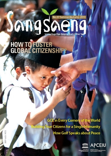 Paving the way together for global citizenship education (SangSaeng no. 37 summer autumn 2013) Year of publication: 2013 Corporate author: APCEIU SangSaeng No. 37- How to Foster Global Citizenship? has been published. In order to help our readers better grasp the concept of global citizenship and provide useful information and new ideas, this issue deals with various aspects of global citizenship education.3 Director’s Message4 Special ColumnBuilding True Citizens for a Single Humanity8 Focus: How to Foster Global Citizenship?8 Eliminating World Challenges through Global Citizenship Education 13 Developing Global Citizens with a Global Perspective18 Living in a New World Starts with Education23 GCE in Every Corners of the World28 Best Practices28 Hands-on Hand Print for Environmental Sustainability32 Bhutan Teachers Learn New Models of Education35 Comic Relief: Song of the City36 Special ReportPaving the Way Together for Global Citizenship Education40 InterviewBuilding a Global Community out of the Ashes of Poverty42 LetterCapturing Moments of Living in Harmony44 Peace in My MemoryHow Golf Speaks about Peace47 Understanding the Asia-Pacific RegionDiscovering Locks beyond the Function of Opening and Closing50 APCEIU in Action