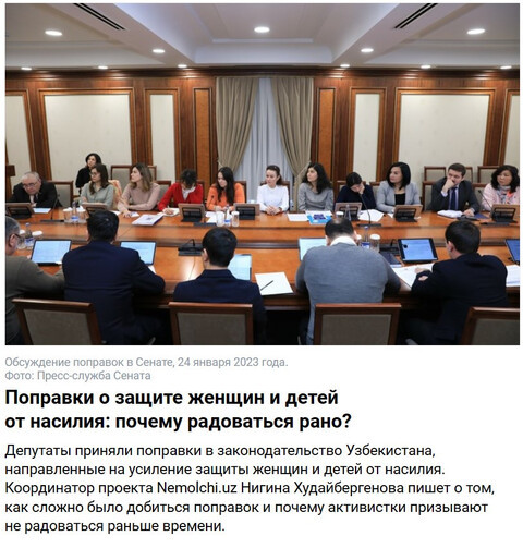 Amendments on the Protection of Women and Children From Violence: Why Is It Too Early To Rejoice? Year of publication: 2023 Author: Нигина Худайбергенова The deputies adopted amendments to the legislation of Uzbekistan aimed at strengthening the protection of women and children from violence. Nigina Khudaibergenova, the coordinator of the Project 'Nemolchi.uz'(Don't be silent) writes about how difficult it was to achieve amendments and why activists urge not to rejoice ahead of time.