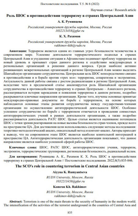 The SCO’s Role in Countering Terrorism in Central Asian Countries (Post-Soviet Studies; Vol.5, No.8) Year of publication: 2022 Author: А. К. Румянцева | К. Х. Рахимов Terrorism is one of the main threats to the security of humanity in the modern world. The intensification of the activities of the terrorist underground in the countries of Central Asia and the deterioration of the situation in Afghanistan raises the problem of terrorism to a new level and calls on the countries of this region to assist international and regional organizations in resolving this issue. Among the most actively developing interregional organizations in the Central Asian region is the Shanghai Cooperation Organization. The central goals of the SCO are directly related to countering and combating the "three evils": terrorism, separatism and extremism. The relevance of this paper relates to the growth of radicalization in the Central Asian region, as a result of which the proposed article analyzes the role of the Shanghai Cooperation Organization in countering terrorism in the countries of the Central Asian region, examines the history of the origin and emergence of terrorism in this region, reveals in detail the key areas of the organization. In addition, the main adopted international legal documents on combating terrorism have been studied, on the basis of which the main stages of the development of cooperation between the member states of the organization for the implementation of anti-terrorist activities of the SCO are observed. Particularly successful cooperation in the fight against terrorism is noted in the conduct of joint anti-terrorist exercises within the framework of the organization's activities, and the activities of the SCO RATS are also considered in detail. The purpose of the article is to assess the potential of the SCO in terms of responding to new security challenges of the member states, primarily in the Central Asian region. To achieve the goal, the following research methods were used: theoretical and methodological analysis, descriptive method, and content analysis. The authors come to the conclusion that at the present stage the SCO is the most influential integration in the space of Central Asia. The organization's anti-terrorist activities show that this field is one of the most successful within the organization's work.