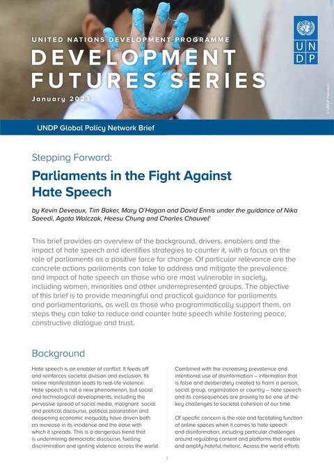 Stepping Forward: Parliaments in the Fight Against Hate Speech Year of publication: 2023 Author: Kevin Deveaux | Tim Baker | Mary O’Hagan | David Ennis Corporate author: United Nations Development Programme (UNDP) This brief provides an overview of the background, drivers, enablers and the impact of hate speech and identifies strategies to counter it, with a focus on the role of parliaments as a positive force for change. Of particular relevance are the concrete actions parliaments can take to address and mitigate the prevalence and impact of hate speech on those who are most vulnerable in society, including women, minorities and other underrepresented groups. The objective of this brief is to provide meaningful and practical guidance for parliaments and parliamentarians, as well as those who programmatically support them, on steps they can take to reduce and counter hate speech while fostering peace, constructive dialogue and trust.
