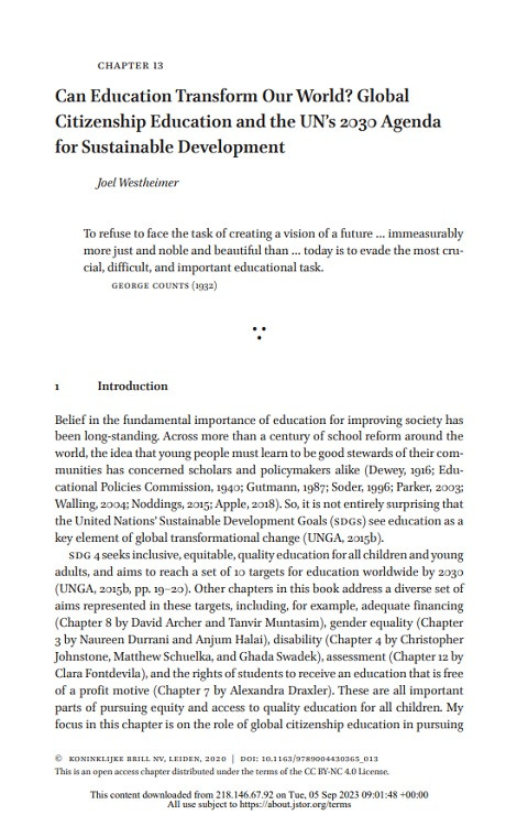 “Can Education Transform Our World?: Global Citizenship Education and the UN’s 2030 Agenda for Sustainable Development” Year of publication: 2020 Author: Joel Westheimer Corporate author: Brill This book chapter is taken from the book Grading Goal Four: Tensions, Threats, and Opportunities in the Sustainable Development Goal on Quality Education, which aims to support the immplementation of Sustainable Development Goal 4 by exploreing various tensions, threats, and opportunities. This chapter specifically focuses on the role of eucation in fostering global citizenship and how educational systems and policies can be improved to facilitate creating a sustainable society and contribute to the 2030 SDG Agenda.
