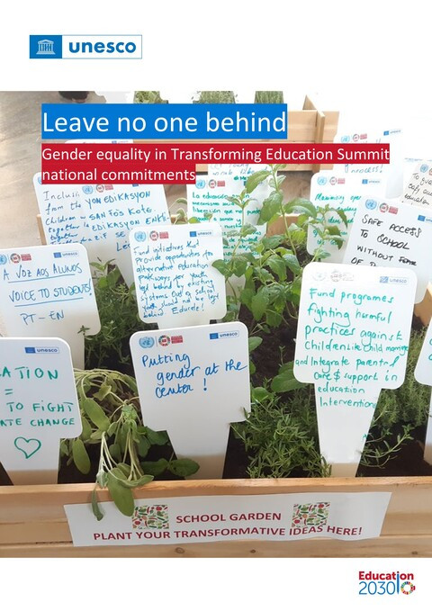 Leave No One Behind: Gender Equality in Transforming Education Summit National Commitments Year of publication: 2023 Corporate author: UNESCO The Transforming Education Summit was convened in response to a global crisis in education – one of equity and inclusion, quality and relevance. This paper applies a gender lens to the national statements of commitments made by countries during the Summit. It considers the scope of commitments to gender equality and gender- transformative education, common gender themes and considerations emerging across commitments, and notable gaps. It aims to inform future actions by the Global Platform to Drive Leadership and Accountability for Gender Equality and Girls’ and Women’s Empowerment in and through Education, and support to country action to transform education systems to advance gender equality.