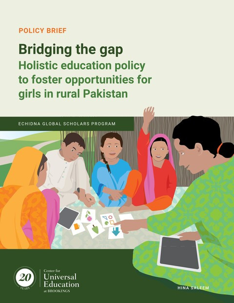 Bridging the Gap: Holistic Education Policy to Foster Opportunities for Girls in Rural Pakistan Year of publication: 2023 Author: Hina Saleem Corporate author: Center for Universal Education at Brookings Seven out of ten girls in rural Sindh are excluded from schooling. This happens for a myriad of reasons and occurs both in the presence and absence of operational school buildings. When schools are present, the challenges that children—especially girls—face due to their economic and social context often go unaddressed; children who are able to enroll in school often find their learning affected by classroom design and practices and experiences that mirror the exclusion they experience outside of school. At the broader level, this exclusion is reflected in limited representation of the needs and aspirations of sizable rural populations in Pakistan’s formal education system and the pathways beyond it. This policy brief presents findings from on-the-ground research in rural settlements in Sindh province that explores the disparities between boys and girls in enrollment and continuation of schooling in addition to overall inadequate education outcomes. It also provides policy recommendations to support all children and particularly girls in meeting their education needs and aspirations. Education policy must respond to these challenges of unmet education needs and aspirations by taking a holistic, welfare-based approach that supports children to overcome the effects of exclusionary conditions to meet their education needs. However, the benefits of such an approach can only be realized if teaching practices and learning experiences are contextualized, build a connection with local knowledge, question root causes of exclusion and support and prepare all children in negotiating pathways beyond education.