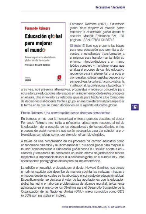 [Book Review] Global Education for a Better World (Ibero-American Journal of Education; vol. 85, no.2) Year of publication: 2021 Author: Patricia Vasquez | Gustavo Rojas Review of the book "Global education to improve the world: how to promote global citizenship from the School" in which Dr. Fernando Reimers proposes the bases for an education that allows teachers and students to transform themselves to also transform their environment. In this work, a complex and multidimensional theoretical framework is presented that analyzes the process of educational change required to implement an education for global citizenship from five perspectives: cultural, psychological, institutional, professional and political.