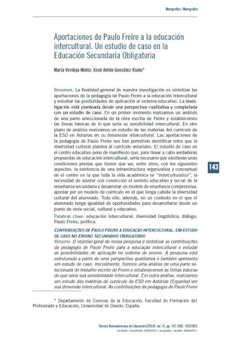 Paulo Freire's Contributions to Intercultural Education: A Case Study in Compulsory Secondary Education (Ibero-American Journal of Education; vol.76) Year of publication: 2018 Author: Maria Verdeja Muniz | Xose Anton Gonzalez Riano The general purpose of this research is to synthesize the contributions of Paulo Freire's pedagogy to intercultural education and study the possibilities of application to the educational system. The research is raised from a qualitative perspective and completed with a case study. At first, an analysis of a selected part of Freire's written work was carried out and the basic lines of what his intercultural sensitivity would be established. In another level of analysis, a study of the subjects of the ESO curriculum in Asturias in its intercultural dimension is carried out. The case study in the educational center shows that, in order to carry out true intercultural education proposals, it would be necessary for there to be some previous conditions that are described in the article.