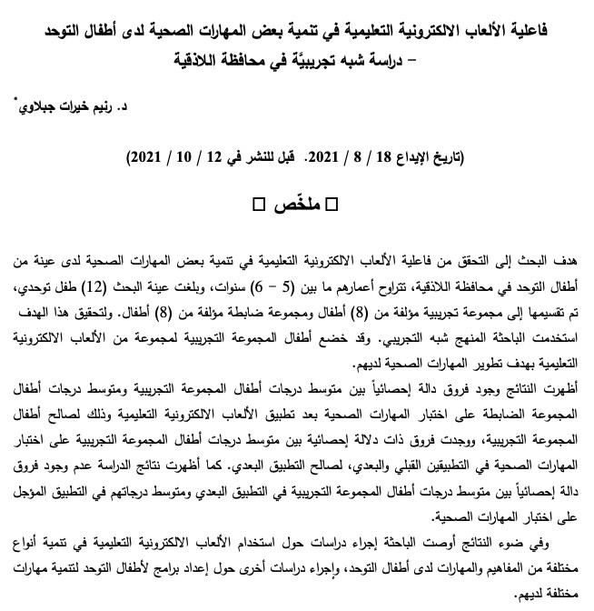 The Effectiveness of Educational Electronic Games in Developing Some Health Skills of Autistic Children Semi-Experimental Study in Lattakia Governorate (Tishreen University Journal for Research and Scientific Studies, Arts and Humanities; vol. 43, no. 5) Year of publication: 2021 Author: Raneem Jablawi Corporate author: Tishreen University "The aim of the research is to verify the effectiveness of educational electronic games in developing some health skills among a sample of autistic children in Lattakia Governorate, their ages ranged between (5-6) years, and the research sample amounted to (12) autistic children, which were divided into an experimental group consisting of (8) children and a control group consisting of (8) children. To achieve this goal, the researcher used the quasi-experimental method. The children of the experimental group were subjected to a set of educational electronic games in order to develop their health skills.The results showed that there were statistically significant differences between the average scores of the children of the experimental group and the average scores of the children of the control group on the health skills test after the application of educational electronic games, in favor of the children of the experimental group, and there were statistically significant differences between the average scores of the children of the experimental group on the health skills test in the two tribal applications. and dimensional, in favor of dimensional application. The results of the study also showed that there were no statistically significant differences between the average scores of the experimental group children in the post application and their average scores in the delayed application on the health skills test.In light of the results, the researcher recommended conducting studies on the use of educational electronic games in developing different types of concepts and skills for autistic children, and conducting other studies on preparing programs for autistic children to develop different skills for them."