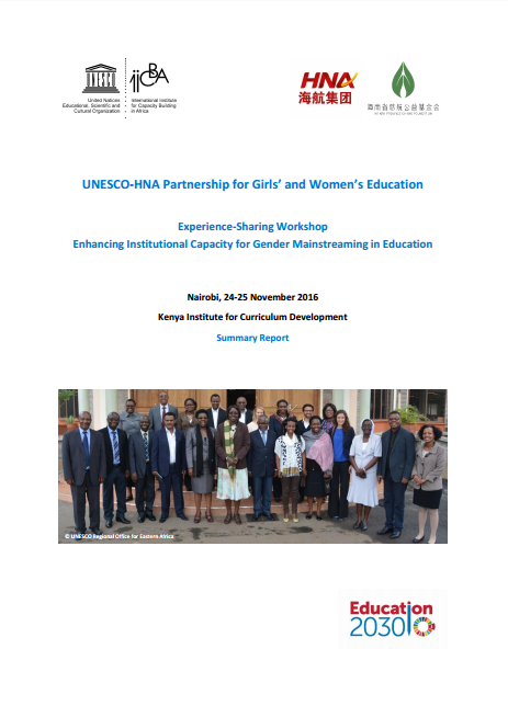 UNESCO-HNA partnership for girls' and women's education: experience-sharing workshop: enhancing institutional capacity for gender mainstreaming in education; summary report Year of publication: 2016 Corporate author: UNESCO International Institute for Capacity-Building in Africa (IICBA) The first experience-sharing workshop was organised on 24-25 November 2016 in Nairobi, Kenya. The objectives of the workshop were to: v Increase awareness on girls' education activities through South-South interaction. v Exchange experiences and lessons on HFIT project implementation. v Enhance institutional networking and interaction on issues related to girls' education.